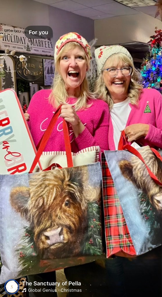 Later that evening, my local Christian bookstore/coffee shop hosted a private holiday event. My sister drove in to celebrate with me, along with our mom’s sister, our cousin, our sister-in-law, my niece-in-law, and a friend. My sister exuberantly wore our mom’s Christmas sweater, and the two of us unintentionally showed up in the same pinks. A fellow party-goer told us we were an inspiration. She’d been losing patience with her ailing mom and seeing us celebrate reminded her that one day her mother wouldn’t be there anymore.